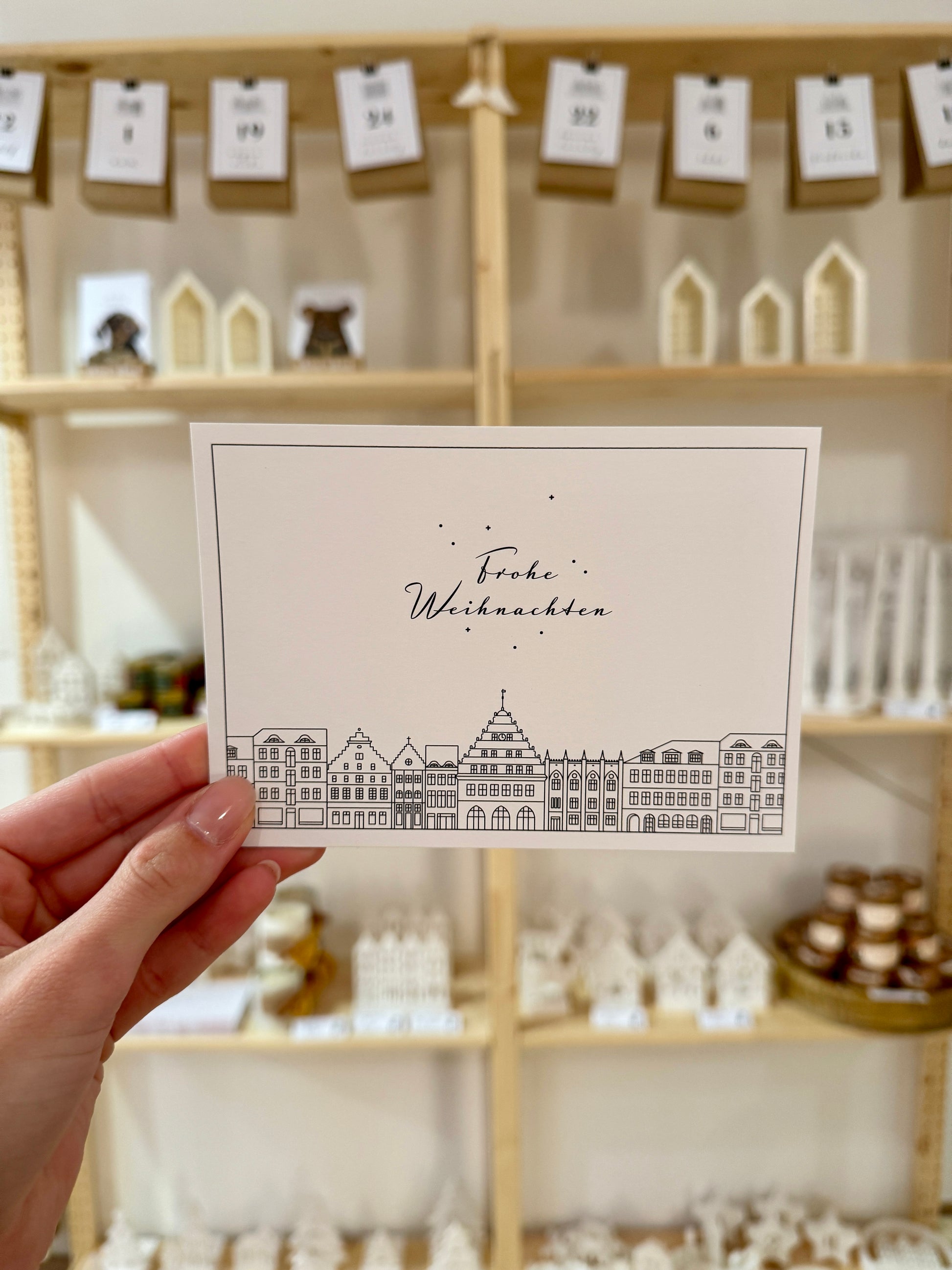 Diese festliche Postkarte vereint die Schönheit der Stadt Greifswald mit dem Zauber der Weihnachtszeit. Das minimalistische Design zeigt die charmante Skyline von Greifswald und trägt den Schriftzug „Frohe Weihnachten“, perfekt, um weihnachtliche Grüße an Familie und Freunde zu senden.