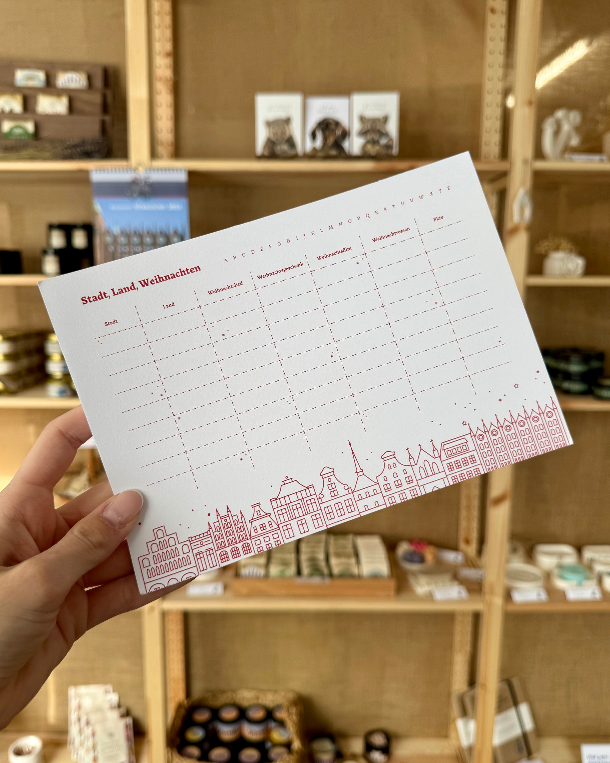 Mit der Stralsund Edition des beliebten Spiels “Stadt, Land, Weihnachten” bringst Du eine besondere Atmosphäre in die Adventszeit. Dieses kreative Spiel ist perfekt für gemütliche Abende mit Familie und Freunden und lässt Dich spielerisch in Weihnachtsstimmung kommen – mit einem Hauch von Stralsund. Finde Begriffe zu Kategorien wie Weihnachtslied, Weihnachtsgeschenk, Weihnachtsfilm und mehr!